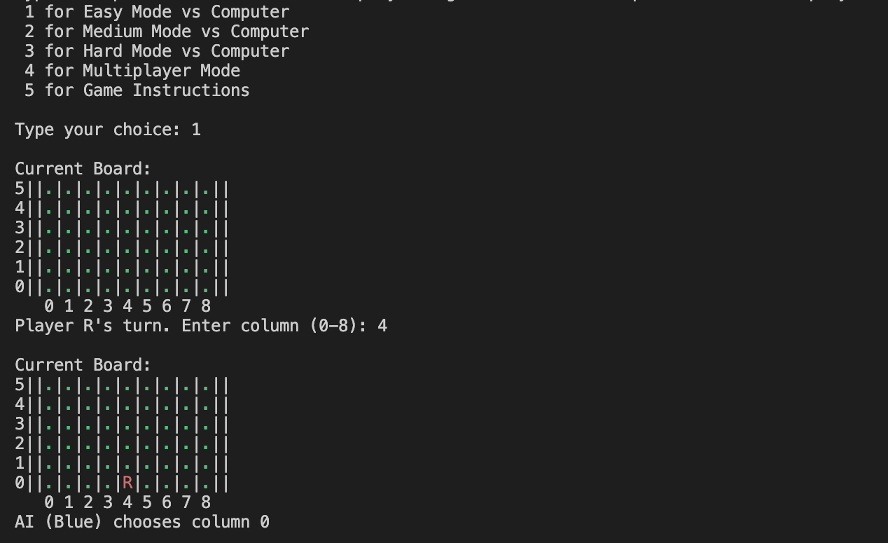 Connect4 game written in OCaml with 4 modes: multiplayer, easy, medium, or hard against computer written using minimax AI algorithm.